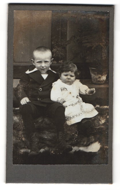 zwei kleine Kinder nebeinander vor Kulisse |